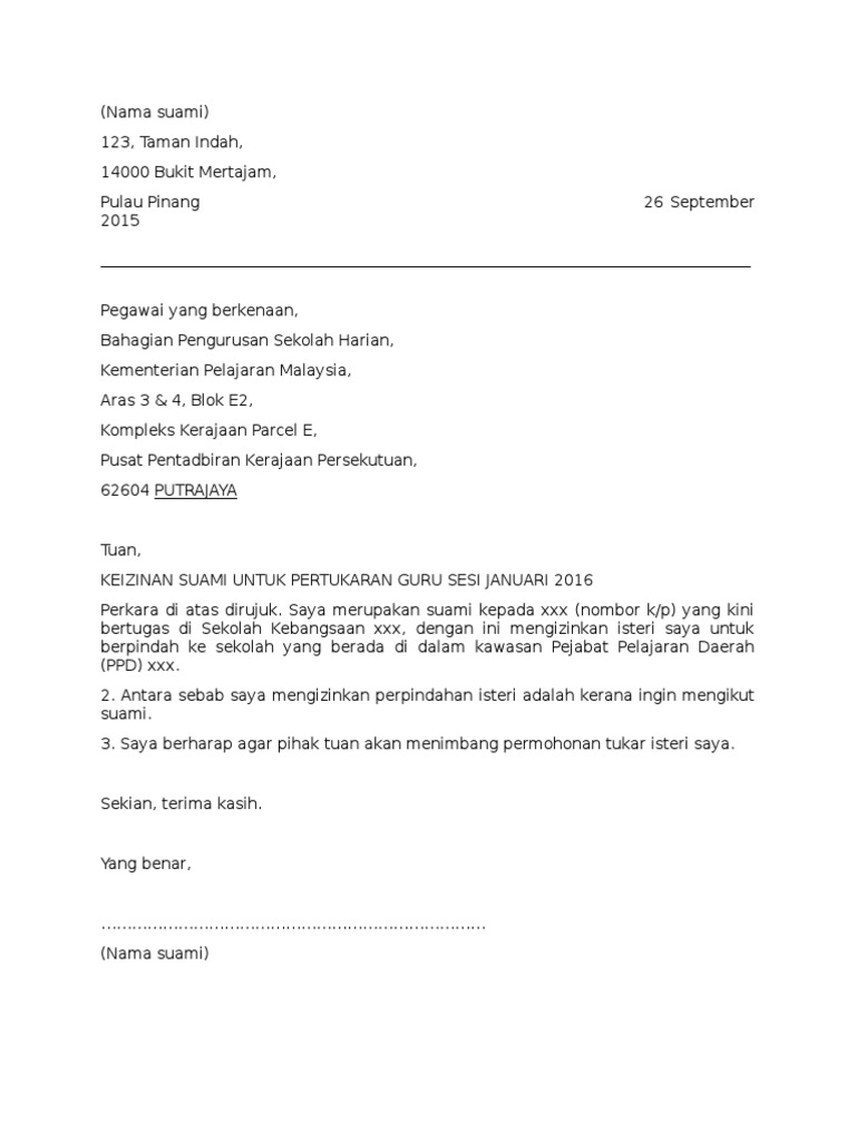 Sep 4 2016 Surat Izin Suami. Bagi mereka yang membuat permohonan pertukaran eGtukar dan memilih alasan mengikut suami boleh. Contoh surat izin suami eg tukar 1.