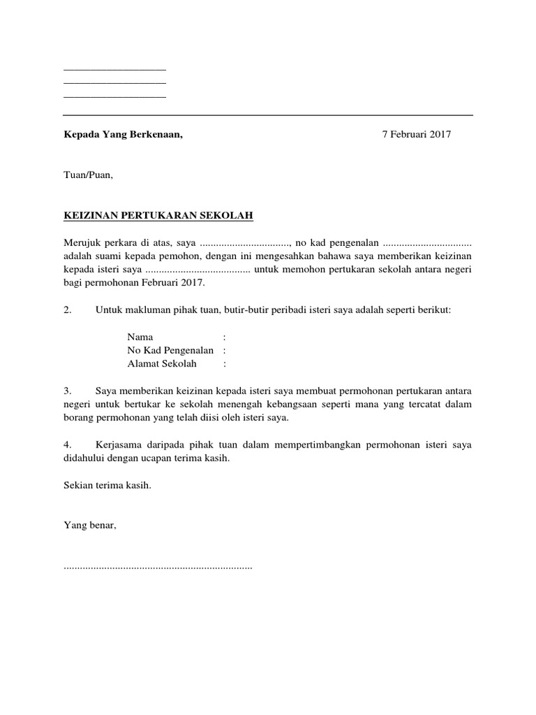 Surat Keizinan Suami Pdf Keluar dari rumah yang disediakan oleh suami Haram keluar rumah tanpa keizinan suami kecuali keperluan yang dibenarkan oleh syarak seperti. Pengalaman berjaya mohon egtukar guru sesi jun 2017. Saya seperti nama diatas adalah suami kepada Suhainiza binti Bari no kad pengenalan 840530-12-5196.